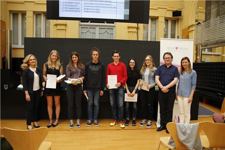 - Die ausgezeichneten "Philosophen" v.l. Siglinde Doblander, Marie Christin Polig, Marie Unterholzner, Moritz Wierer, Hannes Prousch, Yasmin Bagheri, Alexandra Schrötter, Ivan Stuppner und Sigrun Falkensteiner - Foto: LPA/Hilber [JPG 58 KB]