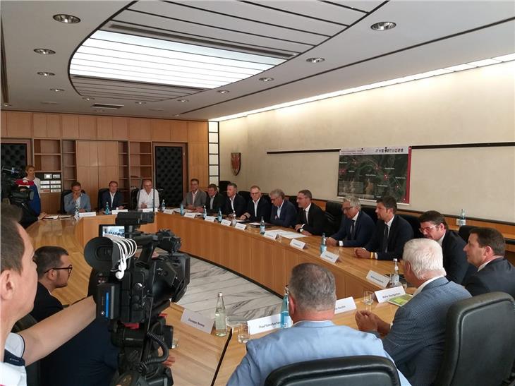 Ausserdorfer, LR  Alfreider, LH Kompatscher (vorne von rechts) und die Bürgermeister beim Treffen zur Unterzeichnung der Vereinbarung zur Genehmigung der BBT Zulaufstrecke Franzensfeste-Waidbruck (FOTO: LPA/Michele Bolognini)