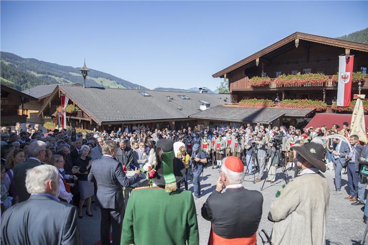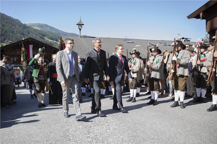 - Landesüblicher Empfang: Die Landeshauptleute schreiten die Schützenkompanie Alpbach ab. (Foto Land Tirol / Sedlak) [JPG 71 KB]