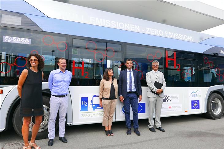 Er ist zwölf Meter lang, hat Plätze für über 80 Fahrgäste und erzeugt beim Fahren keine Schadstoffe: Mobilitätslandesrat Daniel Alfreider, SASA-Präsident Francesco Morandi, SASA-Direktorin Petra Piffer, der Präsident des Wasserstoffzentrums Dieter Theiner und Ressortdirektorin Gabriella Kerschbaumer haben heute (29. August) den neuen Wasserstoff-Batterie-Bus in Bozen unter die Lupe genommen und sind damit Probe gefahren. Der Bus ist ein Prototyp der zwölf neuen Wasserstoff-Batterie-Busse, die das Land ankauft. Ende 2020 soll die Inhouse-Gesellschaft des Landes "Städtischer Autobus Service AG" (SASA) die Busse in Betrieb nehmen. Mitfinanziert wird die neue Flotte zu 30 Prozent über das EU-Projekt JIVE. Für den Kauf weiterer 18 Busse ist eine Ausschreibung in Planung.