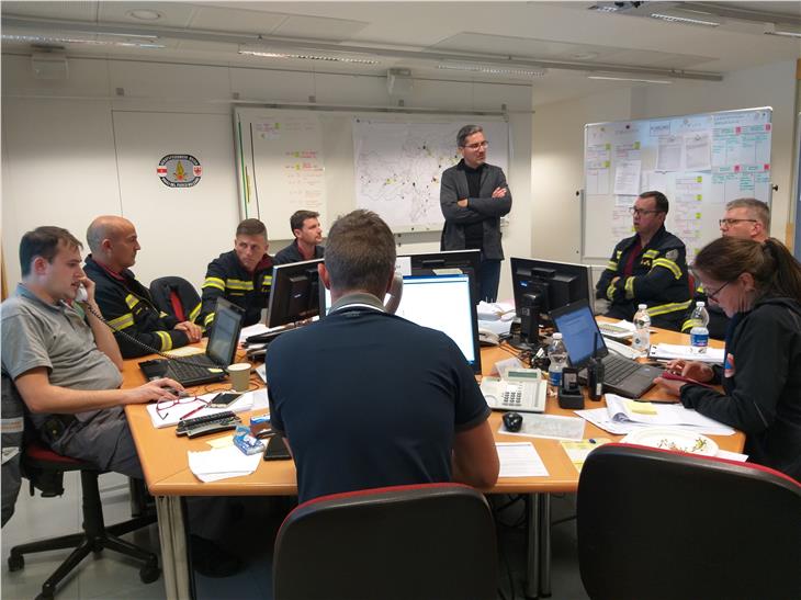 - Dank für Einsatz rund um die Uhr: Landeshauptmann Kompatscher (stehend) heute Abend im Lagezentrum der Berufsfeuerwehr. (Foto: LPA/Maja Clara) [JPG 58 KB]