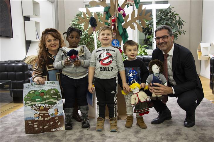 Am 20. November 1989 hat die Generalversammlung der Vereinten Nationen die Kinderrechtskonvention verabschiedet. Anlässlich des 30. Jubiläums hat eine kleine Delegation von Unicef Bozen am heutigen (20. November) Nachmittag Landeshauptmann Arno Kompatscher zwei symbolische Geschenke überreicht: den Baum der Kinderrechte und zwei sogenannte Pigotte. Diese von den Freiwilligen der Unicef gebastelten Stoffpuppen wurden zu diesem speziellen Anlass "personalisert" und nach den Namen des Landeshauptmanns und seiner Frau "Arno" und "Nadja" getauft wurden, wie Unicef-Bozen-Präsidentin Patrizia Daidone erklärte. Diese Puppen kann man zu einer Mindestspende von 20 Euro adoptieren.