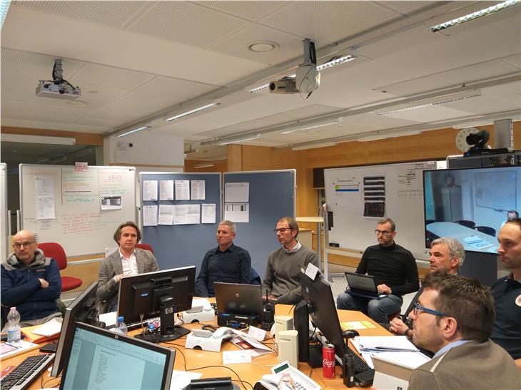 - Lagebesprechung (v.li.); Ressortdirektor Gesundheit Burger, Primar Kaufmann, Feuerwehrpräsident Gapp, Ressortdirektor Bevölkerungsschutz Unterweger, Andreas Simmerle, LR Schuler, Jonas Hochkofler, stv. Agenturdirektor Walcher. (LPA/Maja Clara) [JPG 67 KB]