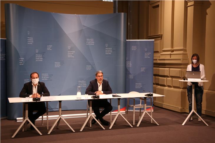 - Bei der heutigen Landesmedienkonferenz: (v.l.) LH-Stellvertreter Vettorato, LH Kompatscher, Moderatorin Silvia Fabbi (Foto: LPA/Fabio Brucculeri) [JPG 43 KB]