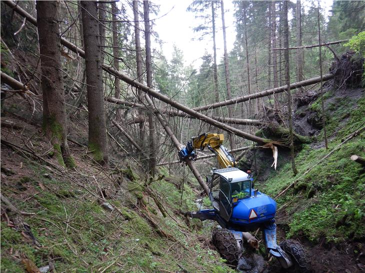 Zahlreiche Bäume waren nach den außergewöhnlich starken Schneefällen im vergangenen Herbst in den Löchlbach und den Zickerbach gestürzt, die in Klausen in den Eisack fließen. Vor der Corona-Krise war damit begonnen worden, das Schadholz mit einem Schreitbagger aus dem Graben zu holen und an den steilen Böschungen zu lagern, berichtet Projektant und Bauleiter Philipp Walder vom Amt für Wildbach- und Lawinenverbauung Nord in der Agentur für Bevölkerungsschutz. Der Bautrupp mit Vorarbeiter Alex Messner führt die aufwändigen Räumarbeiten aus und schließt sie in den kommenden Wochen ab. Diese Arbeiten, unterstreicht Bauleiter Walder, sind dringend, weil das Holz durch das Bachwasser weitertransportiert wird und zu Verklausungen bei Brücken und damit zur Aufstauung des Wassers führen könnte. Die Arbeiten sind gefährlich, da die Stämme unter Spannung stehen und oft mehrere Bäume miteinander verkeilt sind.
