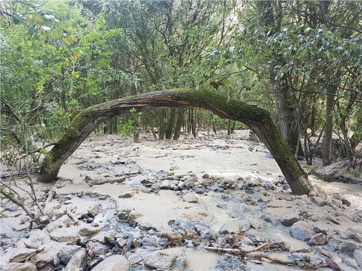 - In den beiden Rückhaltebecken oberhalb von Tschengls hat der Tschenglserbach nach dem gestrigen Starkregen an die 12.000 Kubikmeter Geschiebematerial abgelagert. (Foto: Agentur für Bevölkerungsschutz/Luca Messina) [JPG 105 KB]