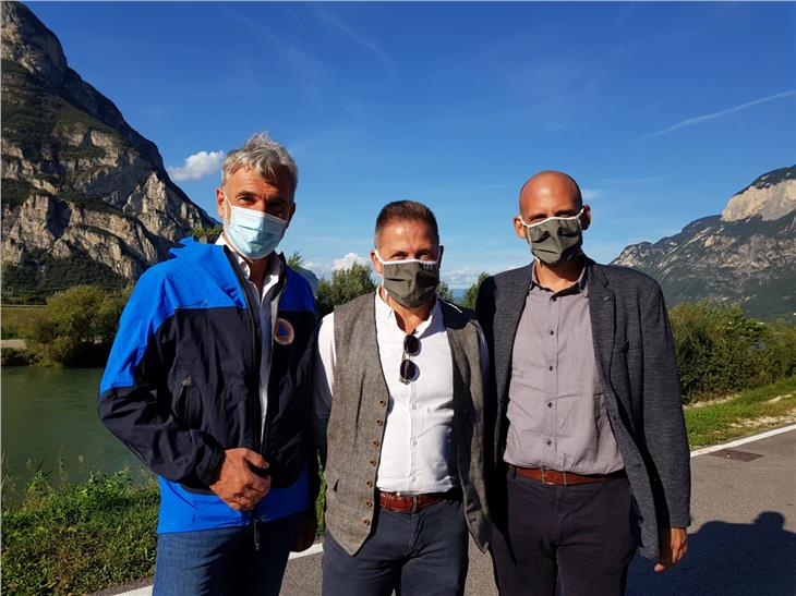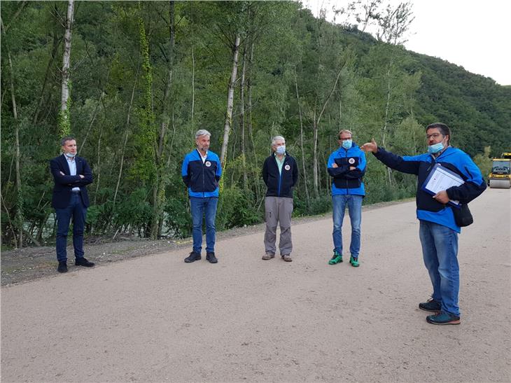 Den Abschluss der Baustellenbesichtigung bildete die Baustelle im Biotop Fischerspitz zwischen Etsch und Eisack in der Gemeinde Bozen, an die sich Vizebürgermeister und Zivilschutzstadtrat Luis Walcher anschloss. Hauptziel der Arbeiten ist die Stabilisierung des Böschungsdammes auf einer Länge von etwa 1200 Metern, um eine sichere Durchfahrt von Baufahrzeugen bei ordentlichen und außerordentlichen Instandhaltungsarbeiten an Etsch und Eisack sowie am Radweg zu gewährleisten. Insbesondere auf der Seite der Etsch wies das Stein-Betonmauerwerk strukturelle Schäden auf. Im Zuge des Eingriffs wurde der entlang der Böschung verlaufende Radweg umgebaut und verbreitert, um ihn nicht nur für Radfahrer, sondern auch für Baufahrzeuge sicherer und zugänglicher zu gestalten. Mit den Arbeiten war unter der Regie von Projektant und Bauleiter Claudio Volcan am 20. Jänner dieses Jahres begonnen worden, nach der Covid-bedingten Unterbrechung wurden die Bauarbeiten für das Projekt mit dem Kostenausmaß von 900.000 Euro wieder aufgenommen, sie werden voraussichtlich noch innerhalb Oktober abgeschlossen.
