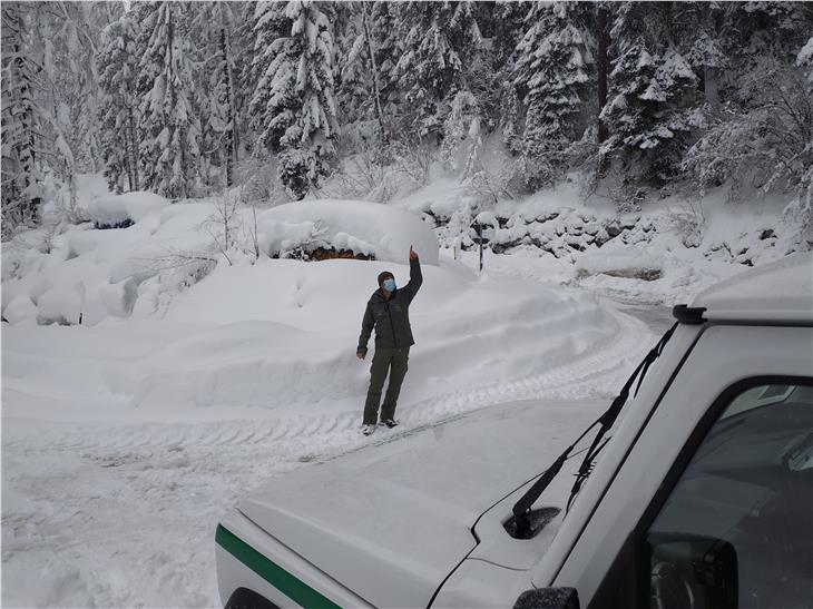 - Auch das Landesforstkorps ist in diesen Tagen der ausnehmend großen Schneemengen in Südtirols Wäldern im Einsatz; im Bild Mitarbeiter der Forststation Toblach. (Foto: LPA/Forststation Toblach) [JPG 150 KB]