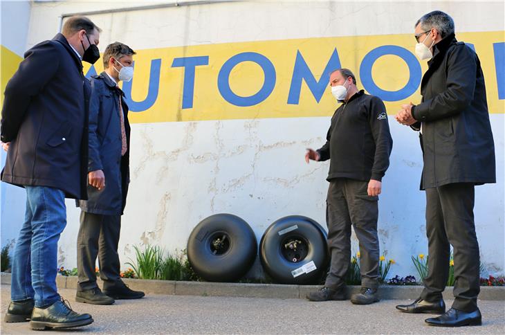 Haben heute die Vereinfachungen bei einem Lokalaugenschein in Bozen besprochen (v.l.): Werkstattbesitzer Dietmar Mock, LR Alfreider, lvh-Vizepräsident Hannes Mussak und Amtsdirektor Markus Kolhaupt (Foto: LPA/Roman Clara)