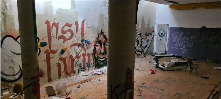 - Beim Lokalaugenschein wurden verschmierte Wände, zerstörte Einrichtung und Bäder sowie Müllablagerungen festgestellt. (Foto: LPA/Landesamt für Bauerhaltung) [JPG 34 KB]