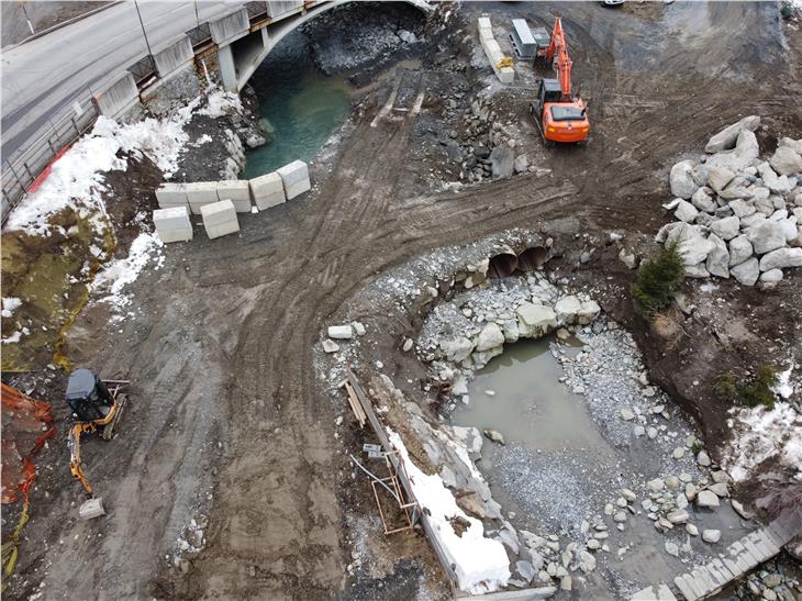 Seit Baubeginn im vergangenen Spätherbst hat die Wildbachmannschaft mit Baustellenleiter Julius Staffler und Vorarbeiter Florian Hofer den Suldenbach umgeleitet und eine Bypass-Leitung verlegt. In den folgenden Wochen wird die bestehende Wildbachsperre abgebrochen und mit einer neuen ersetzt, die mit den notwendigen Messeinrichtungen ausgestattet wird. Gleichzeitig werden die Ufer erhöht, um einen besseren Hochwasserschutz zu gewährleisten, anschließend, voraussichtlich im Herbst, beginnen die Arbeiter mit der Errichtung der brückenartigen Struktur. Voraussichtlich werden die Arbeiten in rund einem Jahr abgeschlossen sein.