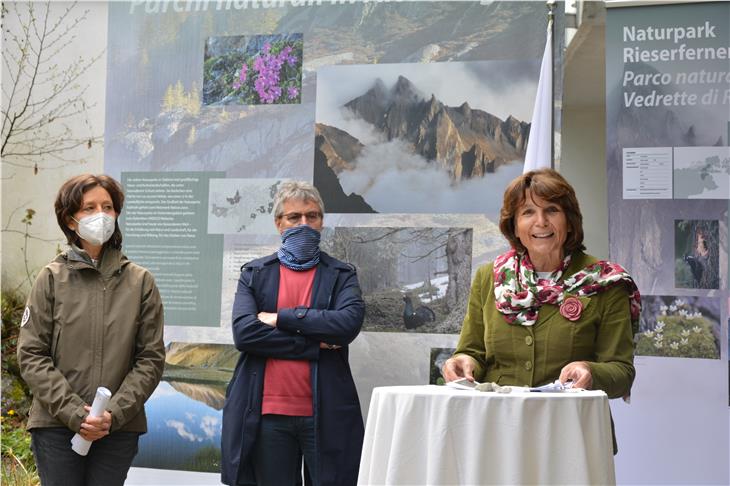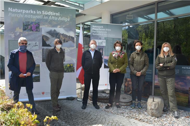 Im Rahmen der heutigen Pressekonferenz (7. Mai) beim Naturparkhaus Rieserferner-Ahrn in Sand in Taufers präsentierte Landesrätin Hochgruber Kuenzer gemeinsam mit der Koordinatorin des Bereichs Umweltbildung im Landesamt für Natur, Margareth Pallhuber, und der Verantwortlichen für das Naturparkhaus Rieserferner-Ahrn, Silvia Oberlechner, die Schwerpunkte des Sommerprogramms 2021 der Naturparke und gab einen Überblick über didaktische Angebote und Investitionen in die Instandhaltung der Parke. Mit dabei waren auch der Präsident des Führungsausschusses des Naturparks Rieserferner-Ahrn, Karl Wolfsgruber, und der Bürgermeister von Sand in Taufers, Josef Nöckler, der die Bedeutung des Naturparks für die Gemeinde und das gesamte Tal unterstrich.