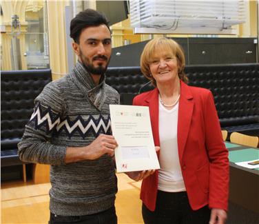 - L'assessora Stocker ha consegnato gli attestati ai richiedenti asilo che hanno sostenuto il testo per l'accertamento delle competenze professionali Foto: USP/fg [JPG 18 KB]
