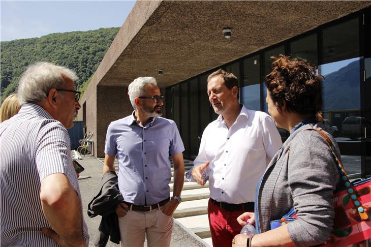 - L'assessore Massimo Bessone, 2° da dx, ha prospettato ai futuri utenti, qui Michael Oberhuber (3° da dx) del Centro di sperimentazione Laimburg, la possibile consegna parziale dell’edificio polifunzionale a Laimburg entro il 2019 - Foto: [JPG 70 KB]