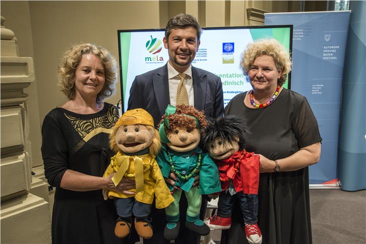 La direttrice delle scuole ladine, Edith Ploner, ha ricordato che "il pluringuismo è al centro delle attività delle 17 scuole dell'infanzia delle nostre vallate". I bambini che frequentano gli asili in Val Gardena e Val Badia lavorano alternativamente ogni settimana in una delle tre lingue ufficiali della Provincia di Bolzano (ladino, tedesco, italiano), e questo passaggio viene rappresentato da tre bambole di colore diverso.