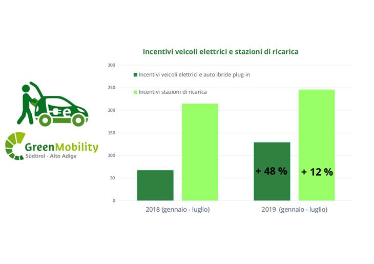 La Ripartizione mobilità ha erogato in totale 467.451 euro di contributi per incentivare la mobilità elettrica rispetto ai 344.880 del 2018, mentre le richieste di incentivazione da parte delle aziende sono passate dalle 40 del 2018 alle 84 del 2019, ovvero più del doppio. In aumento anche per le richieste di contributo presentate da privati cittadini. Tra gennaio e luglio 2018 erano stati 27 gli incentivi per l'acquisto di auto elettriche e di veicoli ibridi con sistema plug in erogati, mentre nello stesso arco temporale nel 2019 sono diventati 45. In totale pertanto nel 2019 sono state presentate 129 richieste, 62 in più (+48%) rispetto al 2018.