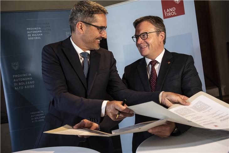 Una strategia coordinata fra Alto Adige e Tirolo per il corridoio del Brennero e per diminuire il traffico di transito: questo il primo tema all’ordine del giorno della seduta congiunta della Giunta provinciale dell’Alto Adige e del Governo del Bundesland Tirolo oggi (4 settembre) nella sede di Castel Tirolo. I due esecutivi hanno approvato una "Dichiarazione congiunta" in 9 punti sulle risultanze delle mozioni discusse nel corso della seduta, ma anche del lavoro preparatorio delle rispettive amministrazioni e dei dialoghi bilaterali. Fra i temi trattati per una sempre maggiore sinergia dei due territori a 100 anni dalla loro separazione alla fine della Prima Guerra Mondiale, l’ordine del giorno includeva il collegamento dell’infrastruttura per la banda larga, il reciproco riconoscimento dei titoli di studio e dei titoli accademici, la creazione di un’offerta formativa comune in ambito clinico, l’assistenza veterinaria su tutto il territorio, lo scambio e il lavoro in rete dell’assistenza agli anziani, l’accoglienza reciproca nei centri antiviolenza, la collaborazione dei musei provinciali e la gestione interregionale dei rischi derivanti da calamità naturali.