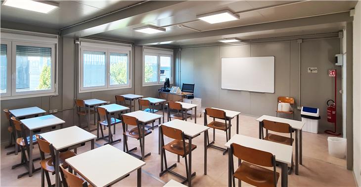 - Gli interni di una delle 4 aule per il Liceo G.Pascoli a Bolzano, allestite provvisoriamente in strutture prefabbricate. (Foto: ASP/Edilizia pubblica) [JPG 49 KB]