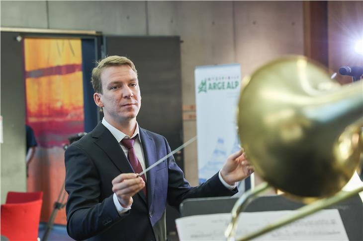 - Il bolzanino Valentin Gasser presso il Mozarteum a Salisburgo ha eseguito la prima della fanfara dell'Arge Alp da lui composta. (Foto: Land Salzburg/Franz Neumayr) [JPG 35 KB]