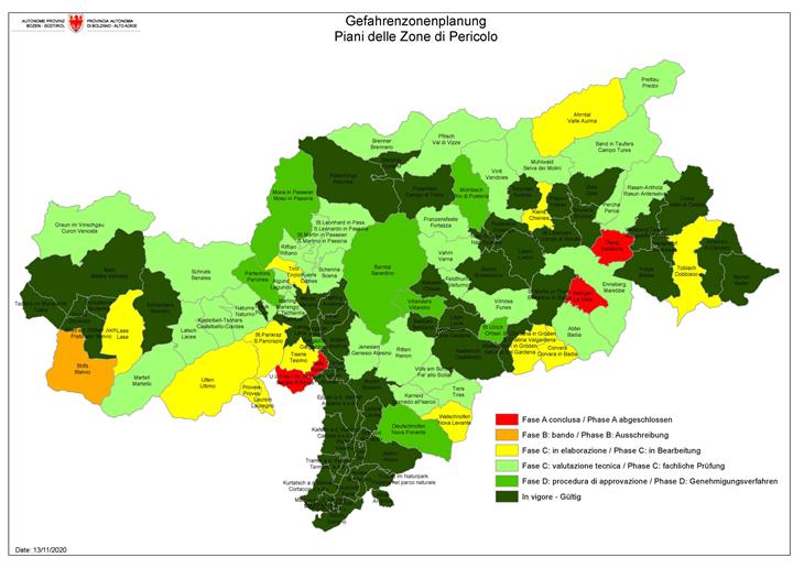 - La cartina con i Comuni e lo stato del rispettivo Piano delle zone di pericolo al novembre 2020. (Foto: ASP/Ripartizione sviluppo territorio e paesaggio) [JPG 54 KB]