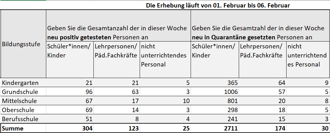 Nella settimana, tra l'1 e il 6 febbraio sono state registrate 452 nuove infezioni da Covid-19 nelle scuole in lingua tedesca dell'Alto Adige. Un numero in calo rispetto alla settimana precedente, durante la quale la cifra complessiva aveva raggiunto 461 casi di positività. In crescita il numero delle persone collocate in quarantena, 2915, rispetto alle 2501 della settimana precedente. I numeri resi noti settimanalmente dalla Direzione istruzione e formazione tedesca includono l'intero corpo docente, il personale non insegnante, nonché bambini e ragazzi dalla scuola dell’infanzia alle scuole superiori.