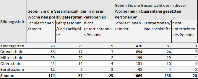 Nelle scuole dell’infanzia sono state registrate, complessivamente, 58 nuove infezioni, 20 delle quali hanno riguardato i bambini, 29 il personale pedagogico, 9 il personale non insegnante. Nelle scuole primarie (elementari) sono stati registrati 82 nuovi casi di positività al Covid-19. 58 riguardano gli alunni, 17 gli insegnanti, mentre 7 infezioni rilevate fanno riferimento al personale non docente. Nelle scuole secondarie di primo grado (medie) vengono segnalate 61 nuove infezioni (39 studenti, 20 professori e 2 impiegati), nelle scuole secondarie di secondo grado (superiori) sono 63 i nuovi casi di positività accertati. 45 vengono segnalati tra gli studenti, 14 tra il personale docente e 4 nel personale non insegnante). Alla formazione professionale, infine, i casi complessivi sono 22 (12 studenti, 7 insegnanti, 3 personale non docente).