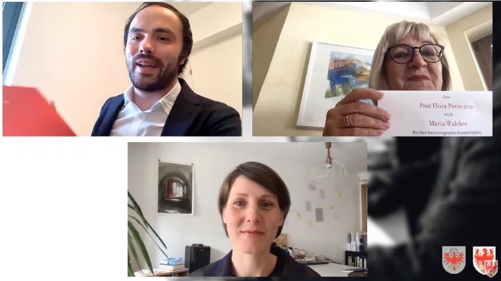 L’artista Maria Walcher, trentasettettenne originaria di Bressanone e residente a Innsbruck, ha ricevuto oggi (15 maggio), nel corso di una cerimonia online, il Premio Paul Flora, in concomitanza con la ricorrenza del dodicesimo anniversario della morte dell'artista venostano. La consegna è avvenuta a cura degli assessori alla cultura della Provincia di Bolzano, Philipp Achammer e del Land Tirolo, Beate Palfrader. I saluti istituzionali, pre-registrati presso la tomba dell’artista altoatesino nel cimitero di Glorenza, sono stati tenuti da Anton Patscheider, commissario della città di Glorenza, e dall’ex sindaco, Alois Frank. L’evento è stato trasmesso in diretta streaming sul canale Youtube della Provincia.